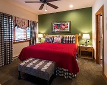 Main level Front Bedroom, king bed, separate from living area, private bath, crib area